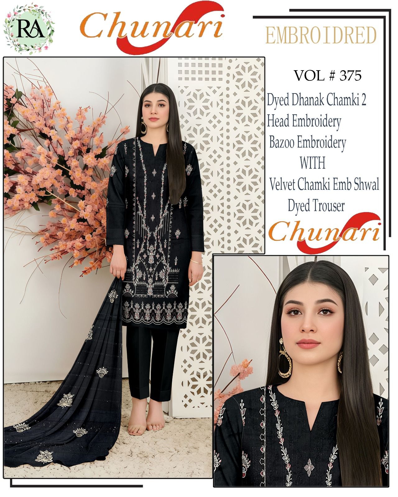 Dhanak 3-piece embroidered suit is typically a luxurious ensemble designed for the winter or transitional season, utilizing the distinct Dhanak fabric, which is known for its soft, medium-weight cotton or cotton blend that offers warmth without being overly heavy. This three-piece set generally comprises a long shirt or kurta, a matching trouser or shalwar, and a shawl or dupatta. The garment is elevated by intricate embroidery, which can range from delicate threadwork on the neckline and sleeves to heavy, all-over patterns across the shirt and even the shawl. The suits are often sold unstitched, allowing for customization, and the accompanying shawl is frequently crafted from Dhanak, wool, or a Masouri/Pashmina blend, sometimes featuring additional embroidery or digital printing to complement the main garment. Overall, it is a popular choice that combines traditional Pakistani fashion with comfort and elaborate detailing, making it suitable for both casual and semi-formal winter wear.